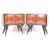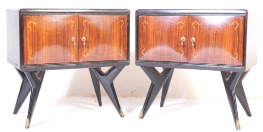 A pair of mid 20th century circa.1950's Italian bedside cabinets in the manner of Paolo Buffa. Each having glass insert to top raised over bowed twin doors with marquetry inlay to edge and pendant handles, over brass mounted ebonised tapering supports. Measures approx 59 x 58 x 34cm.