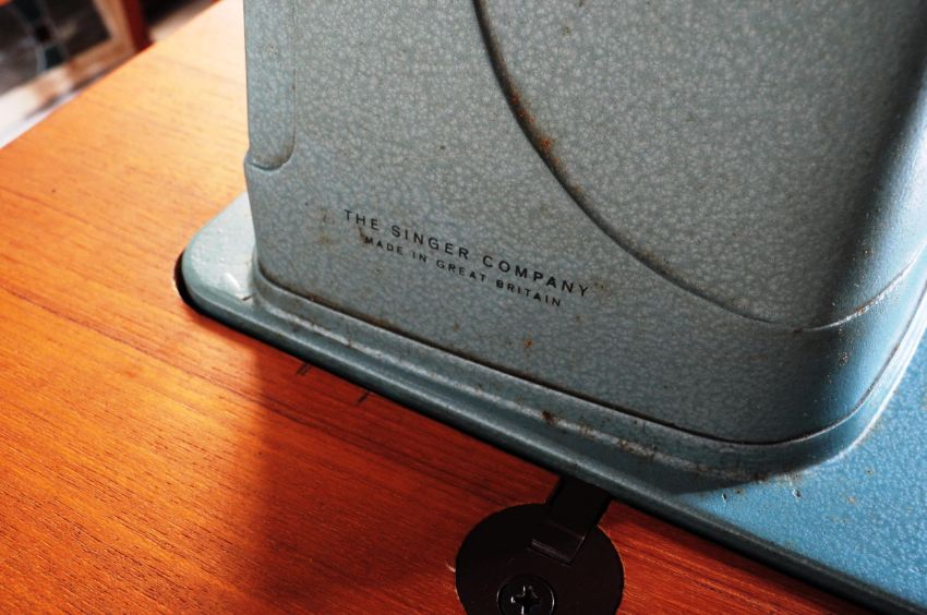 A electric sewing machine by Singer. A sky blue sewing machine housed in its original casing / teak wood table with hinged lid, all raised on tapered round legs. Measures approx 78cm x 65cm x 43cm.