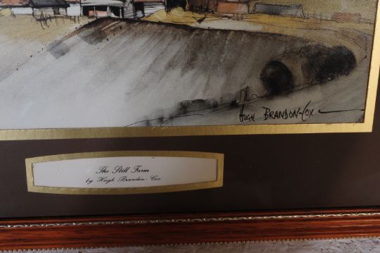 A selection of three framed and glazed prints by artist Hugh Brandon-Cox (1917-2003) to include: ' The White Farm ' , ' The Still Farm ' and ' The Old Water Mill '. These are well appointed prints of original watercolours and all are signed to bottom right by the artist. The larger two measure approximately 62cm x 49cm and the smaller approximately 38cm x 33cm.