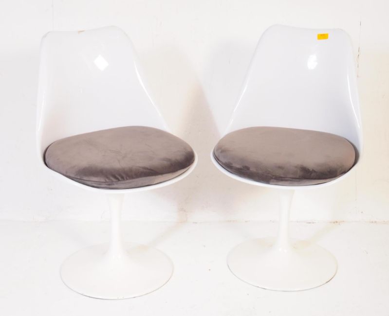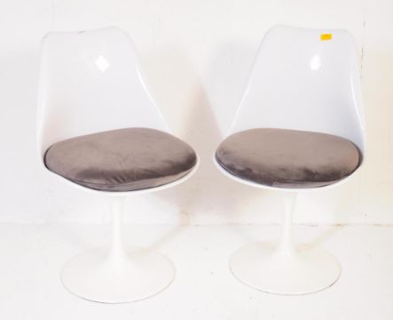 A pair of retro white dining room tulip egg chairs in the style of Eero Saarinen for Arkana. Of plastic construction with grey upholstered cushioned seats on tulip stem support on a circular base. Measures approx. 82cm x 49cm x 44cm.