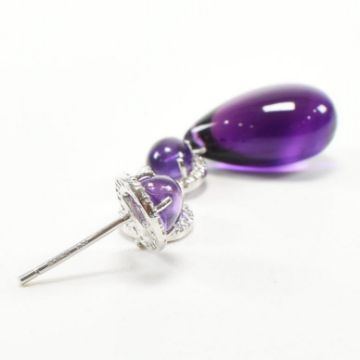 A pair of hallmarked 18ct white gold amethyst and diamond drop earrings. The earrings strung with an amethyst drop surmounted by oval amethyst cabochons framed by round brilliant cut diamonds. Hallmarked London. Weight 9.67g. Measures approx 4.3cm. All weights, measurements and sizes are approximate.