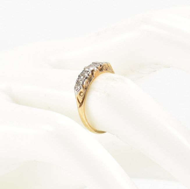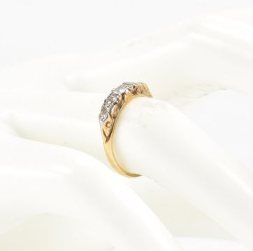 A vintage 18ct gold and diamond five stone ring. The ring being set with five graduating diamonds within a scrolled mount to plain tapering shank. Marked 18ct. Weight 2.4g. Size L. All weights, measurements and sizes are approximate.
