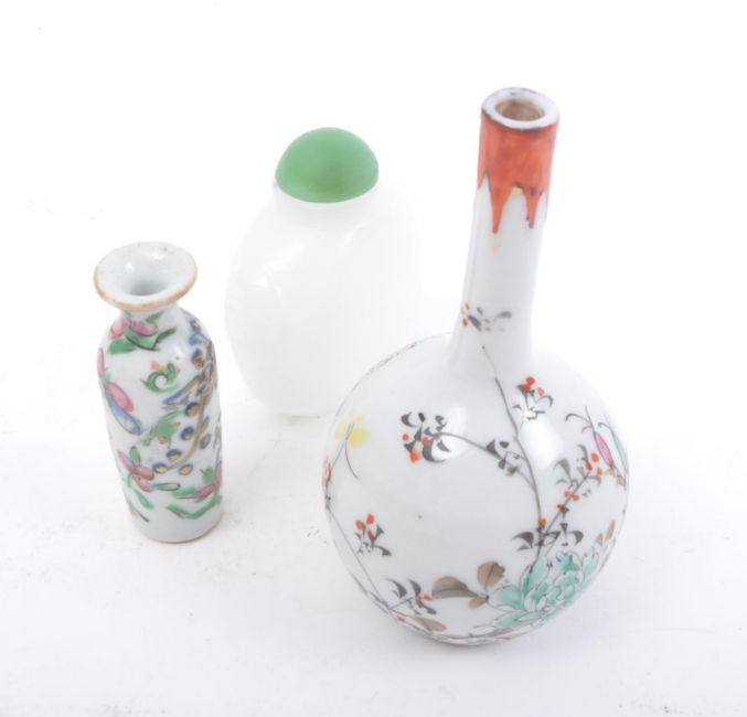 A collection of three small decorative pieces of Chinese ceramics, comprising two famille rose vases each with pink floral & foliate design, and a resin cast white perfume bottle with green glass stopper. Tallest to measure approx. 13cm.