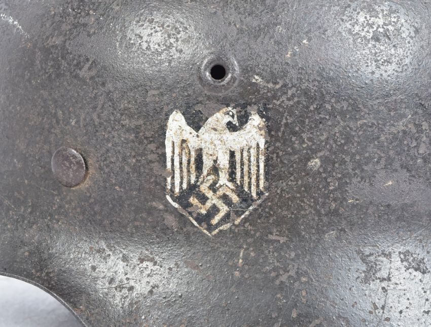An original WWII Second World War Third Reich Nazi German Army M42 pattern steel Stahlhelm. Single Heer decal to one side, fitted with an eight-tongue leather liner and retaining it's original chin strap. Raw edge steel helmet. Impressed to rear rim '2038'. Retains original paintwork.  Supplied with a handwritten letter of provenance from the vendor whose Father retrieved this helmet during the war. It reads in part: 'My Father, A No.4 Commando who landed and fought on Sword Beach on 6/6/44 'D Day' found himself in a farm house in Normandy. A German soldier was dead on the kitchen table, my father took his helmet....James Roy Harding Maxwell, No.4 Commando' Consigned from the family