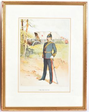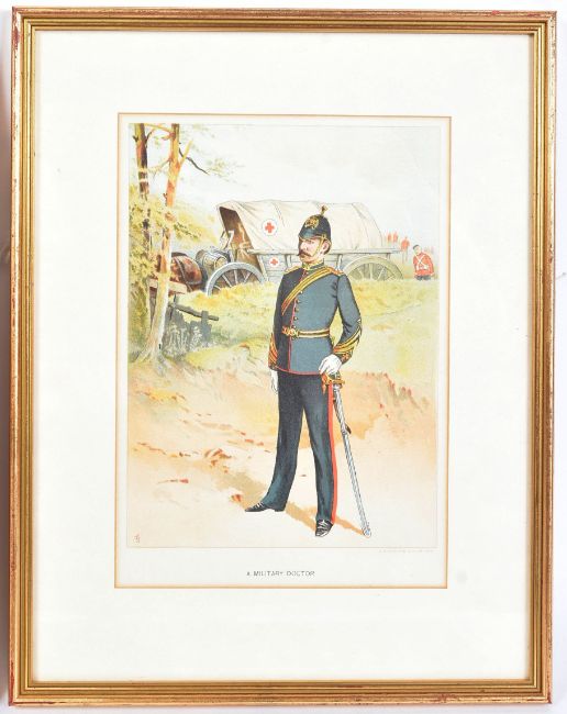 A pair of Victorian 19th century coloured prints relating to the British Army, being a chromolithograph plate from 'Her Majesty's Army' by Walter Richards, and 'The Dorsetshire Regiment (39th and 54th Foot)' by Richard Simkin. Framed and glazed. Each measuring approx. and 37cm x 27cm to include frames.