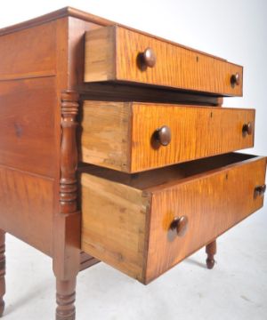 A 19th century, believed Federal American Boston, maple chest of drawers. The chest having three drawers each with turned handles and satinwood fronts flanked by turned spindles. All raised on turned supports. Measures approx. 96cm x 88cm x 45cm.