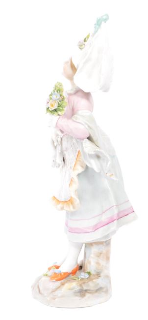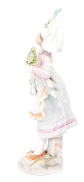 An early 20th Century circa 1940's Meissen porcelain china figurine. Comprising of a lady wearing a bonnet with floral bouquet and handkerchief. Measures 26.5cm.