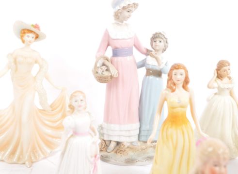 A collection of fine bone china and one resin female lady figurines by Royal Doulton, Staffordshire Ashley, Carl Scheidig, Coalport & The Leonardo Collection. Comprising of; English Rose - P075 (Regal Collection), October Opal - HN4979 (Royal Doulton Gemstones collection), Pretty as a Picture - HN4312 (Royal Doulton classics collection modelled by Nada M Pedley), Georgina (The Leonardo Collection), Sarah (The Leonardo Collection), Ladies of Fashion - Carnival (Coalport), Adrienne - HN 2304 (Royal Doulton), Vera (Staffordshire Ashley), Gemma - (Staffordshire Ashley), Laura (Staffordshire Ashley), Mother & Daughter collecting flowers (Carl Scheidig), along with a crystal glass lady figurine. Tallest measures 25cm (height).