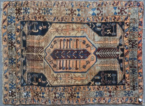 A early to mid 20th century Persian Islamic Hariz carpet floor rug. Having a shaped central panel encapsulated in a black ground, with various sized inner and outer border with repeating geometric pattern. Measures approx. 170cm x 120cm