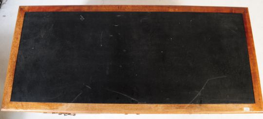 A 20th century walnut twin pedestal writing desk. The desk having black skiver over row of three drawers,flanked by pedestals supports of three drawers, each with metal swan neck handles. Measures 77cm x 168cm x 76cm.