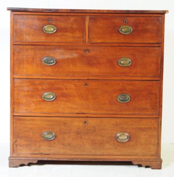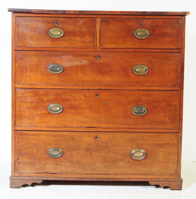 A George III 19th century mahogany chest of drawers. Rectangular form with bordered top, configuration of two over three drawers. Supported on bracket feet with oval hanging metal pulls. Measures approx 99 x 99 x 54 cm.