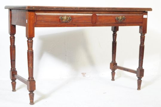 Victorian 19th century mahogany writing table desk. Raised on turned legs united by stretchers having twin drawer frieze with brass handles having flared top set above. Measures 68cm x 106cm x 52cm.