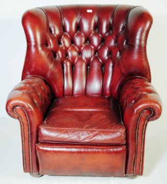 A 20th century oxblood leather chesterfield wingback armchair. The chair having tufting to chair back and arm rests with removable cushion to seat. Measures 94cm x 90cm x 80cm.