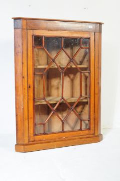 A 19th century Victorian mahogany inlaid astragal glazed corner cabinet. The cabinet having inlaid frieze over astragal glazed single door, opening to reveal shelved interior. Measures 114cm x 91cm x 41cm.