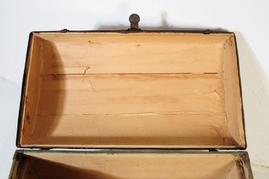 An early 20th century canvas and wooden bound dome top steamer travel trunk. The case having domed top with wooden bow fixtures and metal strap hinge. Measures 52cm x 82cm x 46cm.