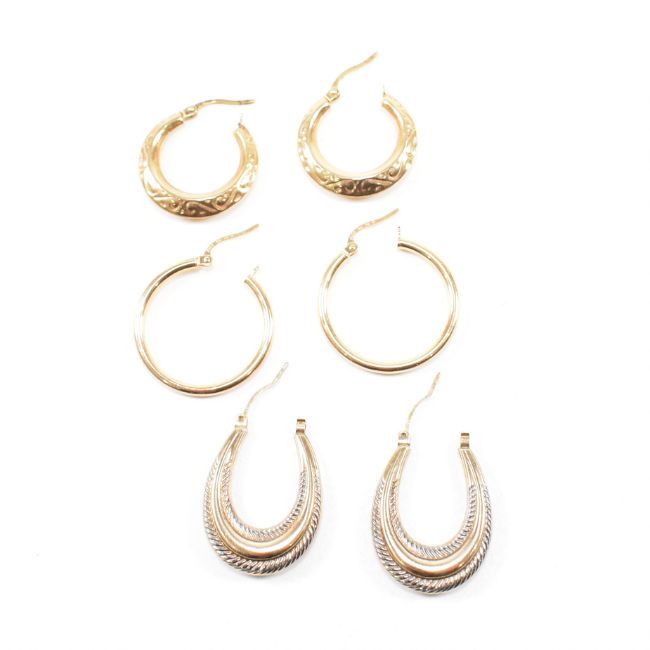 Two pairs of Italian 9ct gold tube hoop earrings together with a pair of unmarked pair of yellow and white metal tube hoop earrings. Two pairs having Italian marks for 9ct gold. Combined weight for all three pairs is approximately 4.3g. Gold weight approx 2.7g. Largest gold hoops measure 2.5cm diameter.