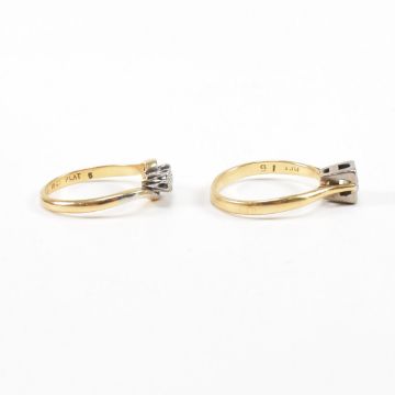 Two 18ct gold and diamond rings diamond rings. A three stone diamond ring marked HG&S 18CT PLAT. Estimated total diamond weight 0.10ct. Size I.5. An 18ct gold solitaire ring set with a round brilliant cut diamond, marked 18ct, estimated diamond weight 0.20ct. Size J.5.  Combined weight approximately 4.8g.