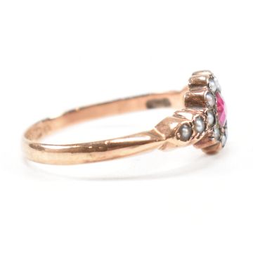 An antique hallmarked 9ct rose gold, synthetic ruby and seed pearl halo ring. The ring having a central round cut ruby encompassed by a cluster of seed pearls to form a flower like floral head to knife edge shoulders and straight shank. Hallmarked for Birmingham 1897, makers marks rubbed. Total weight approx 1.8g. Approx size Q. Head measures approx 0.8cm.
