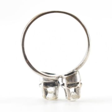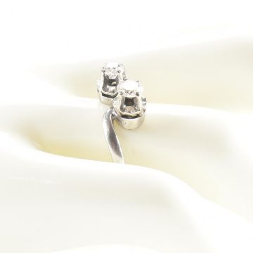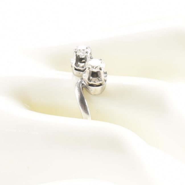 An early 20th Century Edwardian white gold and diamond crossover. The ring being set with two round brilliant cut diamonds. Unmarked tests indicate 9ct gold. Weight 2.7g. Size O. Diamonds estimated approx 0.68ct. Unmarked, tests indicate 9ct gold. All weights, measurements and sizes are approximate.