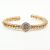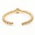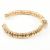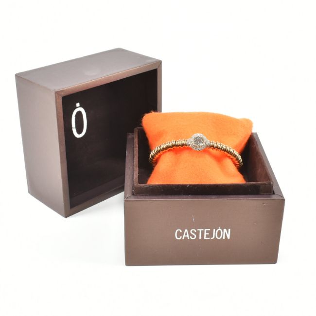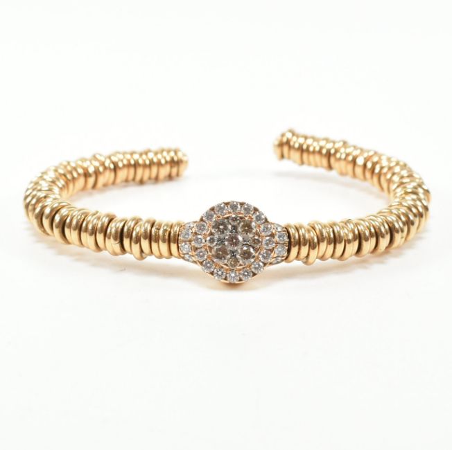 An 18ct yellow gold and diamond cluster bangle bracelet. The cuff bangle comprised of gold ring beads to the central round cut diamond cluster head having nine diamonds surrounded by a halo of further diamonds. Marked to verso 750pv. Central diamond measures approx 2.7x2.7mm. Total weight approx 16.9g. Measures approx 5.5cm. In Castejon box. All weights, measurements and sizes are approximate.