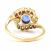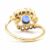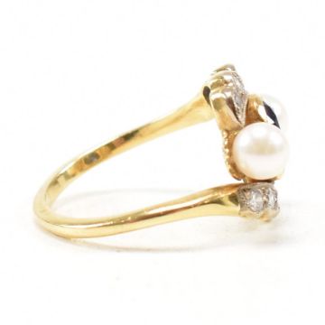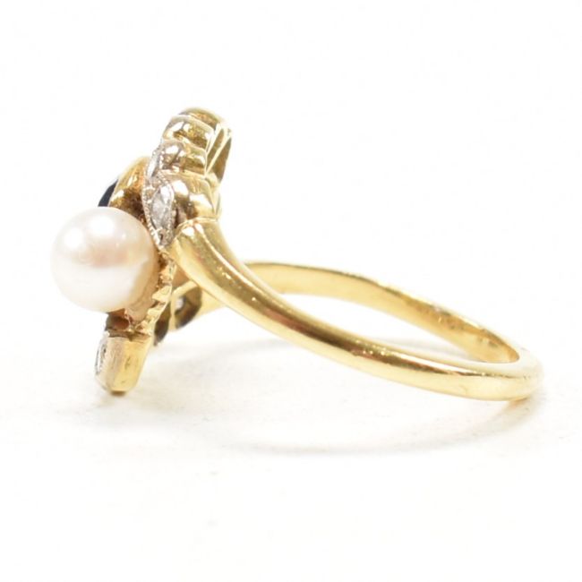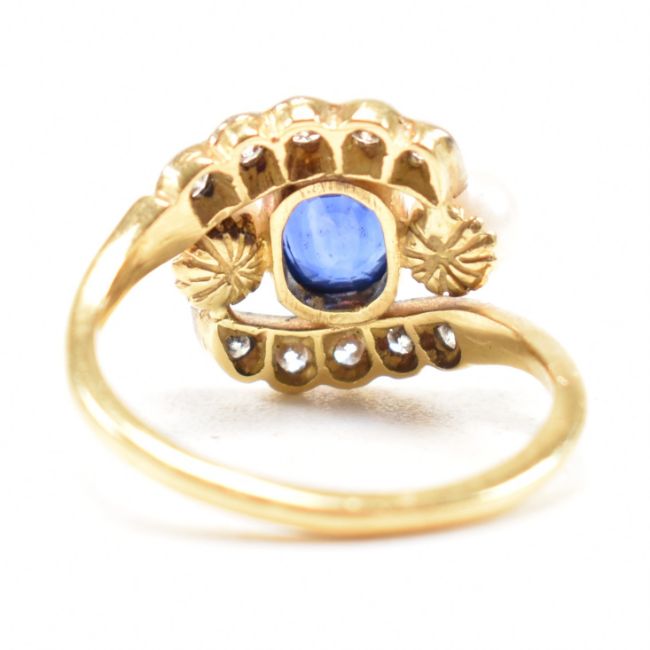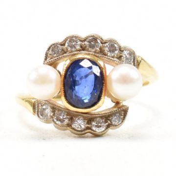 A sapphire diamond and pearl cluster crossover ring. The ring having an oval cut milgrain set blue stone flanked by a round white pearl to each side and having a crossover border of round cut diamonds on a straight shank. Unmarked, tests indicate 18ct gold. Principle stone measures approx 6x4.7x3mm. Total weight approx 3.3g. Approx size J. Head measures approx 12.3mm.