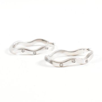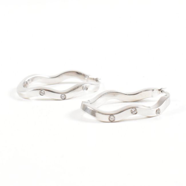 A pair of hallmarked 9ct white gold and white stone hoop earrings. The hoops of undulating oval form set with three round cut white stones to the obverse to hinged posts and click down clasps. Hallmarked for London. Total weight approx 4.4g. Measure approx 3cm. Width approx 0.4cm.