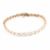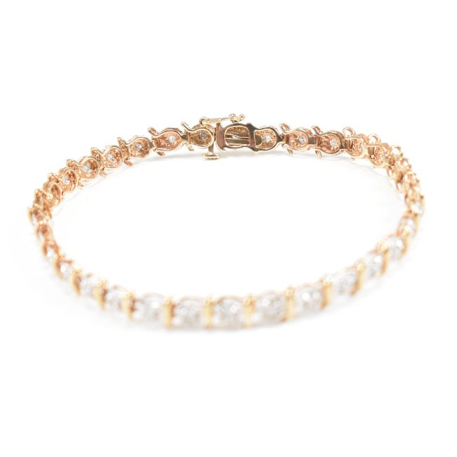 A hallmarked 9ct bi colour gold and diamond line bracelet. The bracelet of tennis style having round cut accent diamonds star set to white gold discs spaced between yellow gold tapering bars united by a box clasp and safety catch. Hallmark rubbed to be illegible. Total weight approx 6.6g. Measures approx 19cm. Width approx 0.5cm.