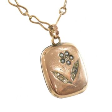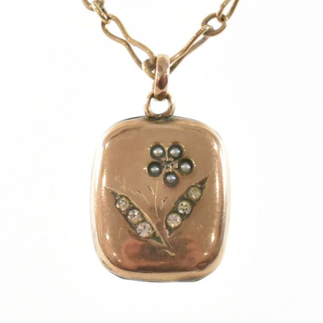 An antique 9ct gold necklace chain and pendant locket. The chain comprised of peanut and cable links united by a spring ring clasp, marked 9ct, suspending a rounded rectangular locket with white stone and seed pearl set flower motif to the centre and hinged opening. Total weight approx 7.0g. Chain measures approx 42cm. All weights, measurements and sizes are approximate.
