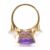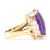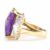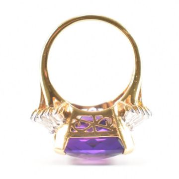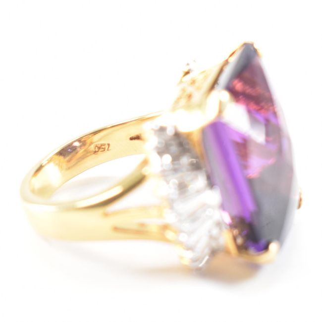 A gold amethyst and diamond cocktail dress ring. The ring being set with a rectangular cut amethyst to the centre with a further 18 trapeze cut diamonds to the shoulders. Marked 750 to the band. Weight 14.0g. Size N. Amethyst estimated approx 15ct, diamonds estimated approx 1.8ct.