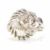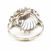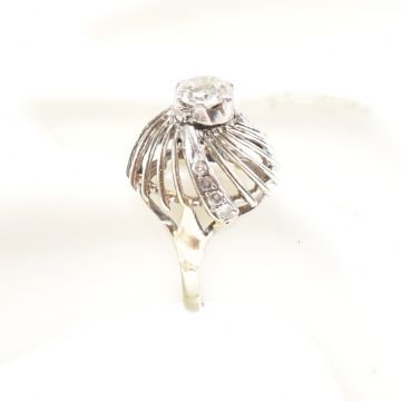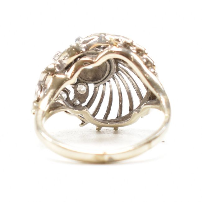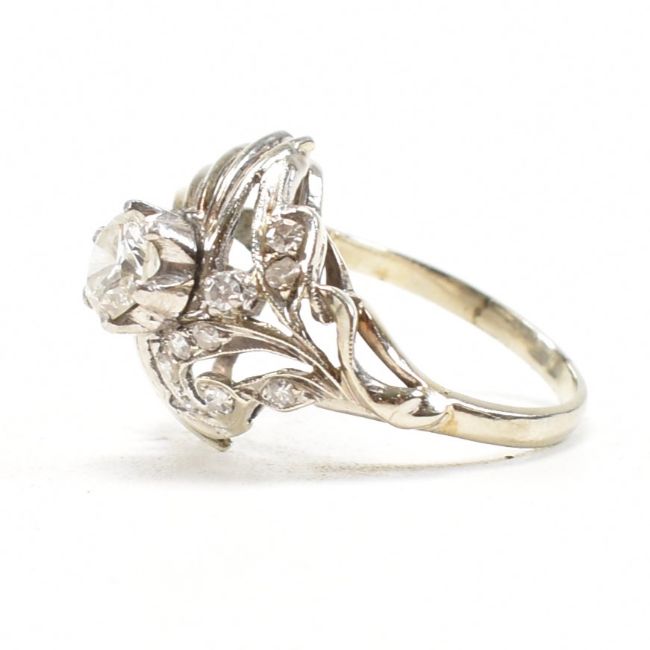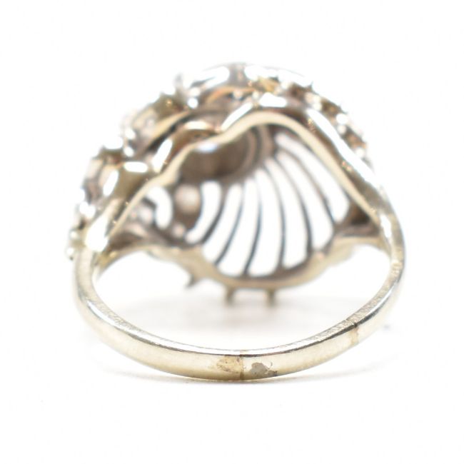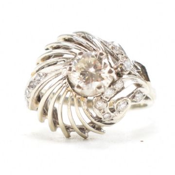 A retro diamond and white metal cocktail ring. The ring having a pierced bombe style peacock feather design head with a round cut diamond surrounded by further milgrain set accent diamonds on a straight shank. Unmarked, tests indicate between 9ct and 14ct gold. Visible repairs / replacement to shank. Principle stone measures approx 5.1x5.1x2.1mm. Total weight approx 4.1g. Approx size J. Head measures approx 14mm.