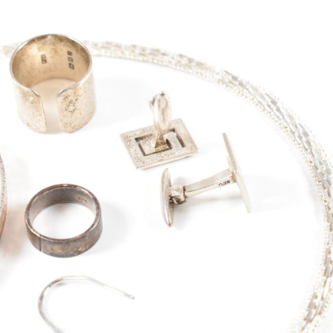 A collection of vintage and later sterling silver jewellery. The lot to include a fancy link wishbone V necklace chain, a pair of tear drop earrings, a pair of rectangular spiral hinged whale back cufflinks, band ring, etched flat link line bracelet and a cuff band ring, hallmarked for London 1966, makers marks for PJH - Patricia Jean Hamilton. All hallmarked or marked 925. Total weight approx 60.8g. Largest item measures approx 43cm.