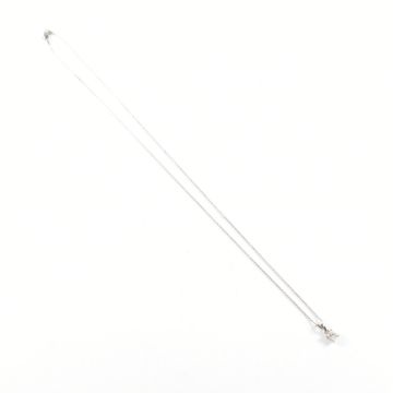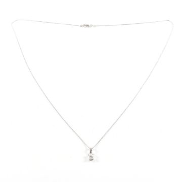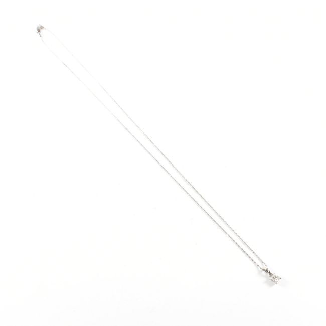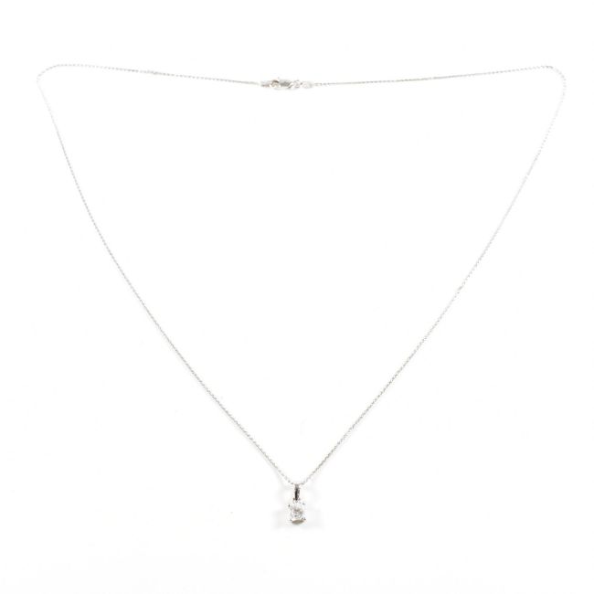 A 14ct white gold and diamond solitaire pendant necklace. The necklace strung with a princess cut diamond in a four prong mount strung upon a 14ct gold foxtail chain. Estimated total diamond weight 0.50ct. Total weight 2.8g. Chain measures approx 50cm. Pendant 1.1cm. All weights, measurements and sizes are approximate.