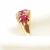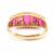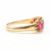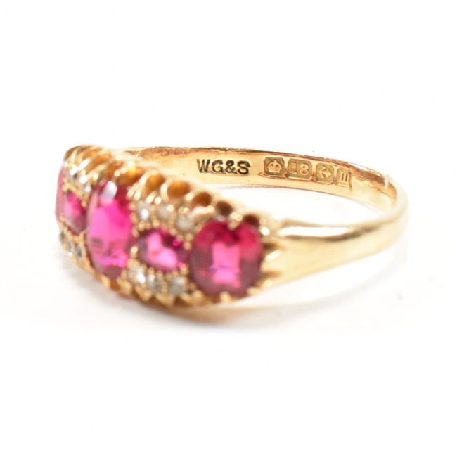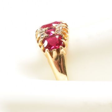 An Antique hallmarked 18ct yellow gold, synthetic ruby and diamond cluster ring. The ring having a central oval cut ruby flanked by graduated oval rubies and further rectangular cut rubies with round cut accent diamonds between all to a buttercup set head on a tapering shank. Hallmarked for Birmingham 1911, makers marks for W.G&S - William Griffiths & Sons. Visible repair to shank at shoulder. Principle stone measures approx 7x5.5x3.5mm. Total weight approx 6.0g. Approx size T. Head width approx 9.3mm.