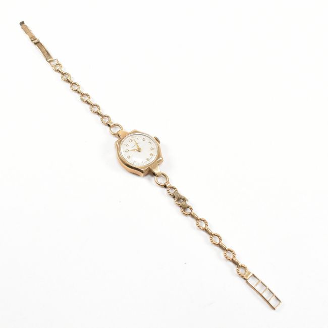 A 9ct gold Garrard of London dress watch.  The watch with champagne dial, Arabic number chapter ring with dagger hands, the dial marked Garrard. Set to a hallmarked Birmingham gold bracelet strap. Sponsors mark B&S. Total weight 14,4g