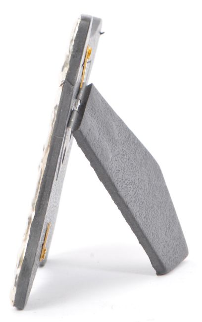 A small silver rococo photograph frame with leather easel back. Central oval panel to centre. Unmarked, tests indicate silver. Measures 8cm  x 9cm