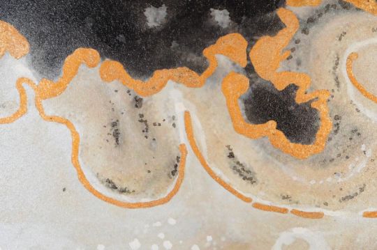A 20th century abstract mixed media ink and acrylic painting depicting a geode type pattern. The painting having various shades of blue with azurine type bronze glitter running throughout. Signed by the artist to the left hand corner. Measures approx. 108cm x 107cm.