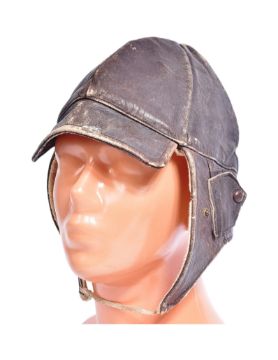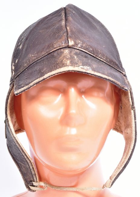 A WWI First World War RFC Royal Flying Corps flying helmet. Leather construction with a chamois interior and buttoned ear flaps. Dated inside 15 along with broad arrow mark.