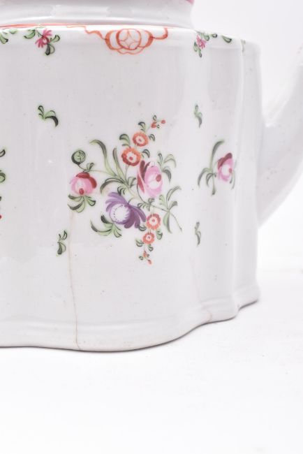 A late 18th Century Caughley lidded china teapot. The teapot decorated with red floral decoration, of squat form. Marked 186 to base. Measures approx. 16cm tall, 24cm long.