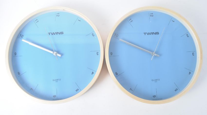 A pair of matched late 20th century circa 1990s - 2000s design wall clocks. Each clock of layered beech with chrome dial and baby blue face. Marked to face TWINS. Measuring approx. 31cm across.