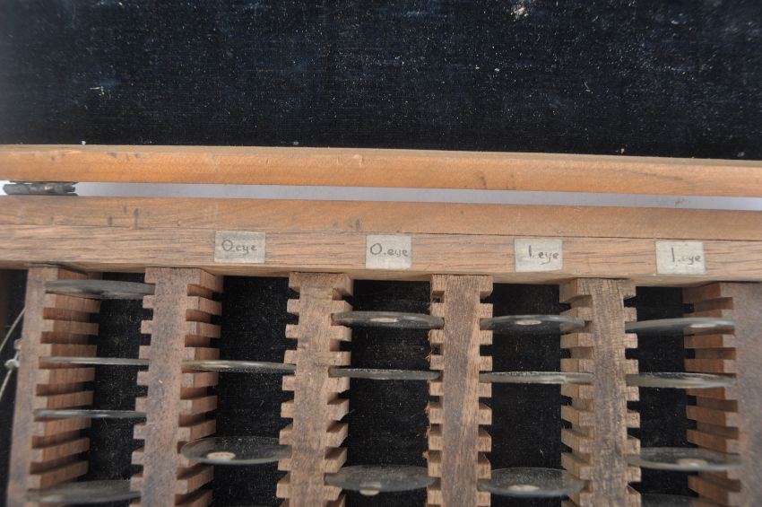 An early 20th Century travelling optician's / ophthalmology spectacle lens case. Featuring a period pair of frames, with approximately 50 varying prescription lenses. Box measures approx. 26cm x 20cm.