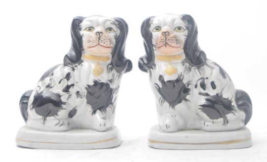A pair of 19th century Victorian Staffordshire ceramic mantlepiece dogs / spaniels. The pair each in black and white, with hand-painted features. Unmarked. Measuring approx. 16cm tall.