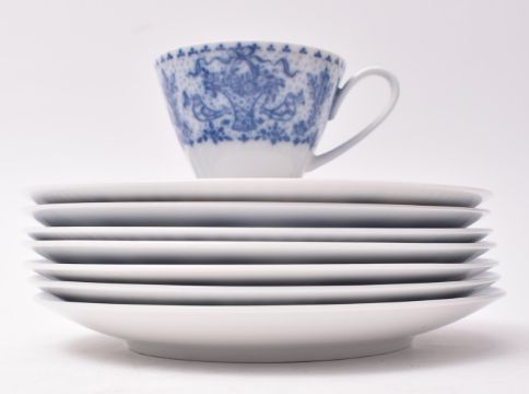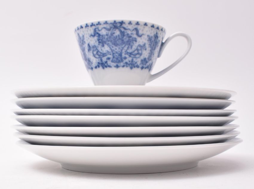 Rosenthal - a mid 20th century German tea service. The service of white ground with blue bird and foliate decoration to the edges. Comprising a teapot with lid, five teacups and saucers and seven cake plates. The teapot to measure approx. 22cm tall.