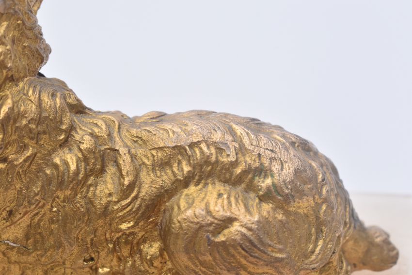 A late 19th Century high Victorian alabaster mantle clock. The clock featuring a gilt metal reclining golden retriever dog finial on plinth, the enamel face with Roman numerals. The whole thing on stepped base with bun feet. Sold as untested. Measures approx. 23cm tall, 20cm long.