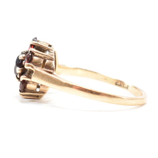 A vintage hallmarked 9ct yellow gold and garnet cluster ring. The retro ring having a round cut red stone surrounded by a halo of further garnets to form a flower head on cathedral style shoulders and tapering shank. Hallmarked for London 1964, makers marks for G&T.J. Total weight approx 3.3g. Approx size P.5. Head measures approx 10.6mm.