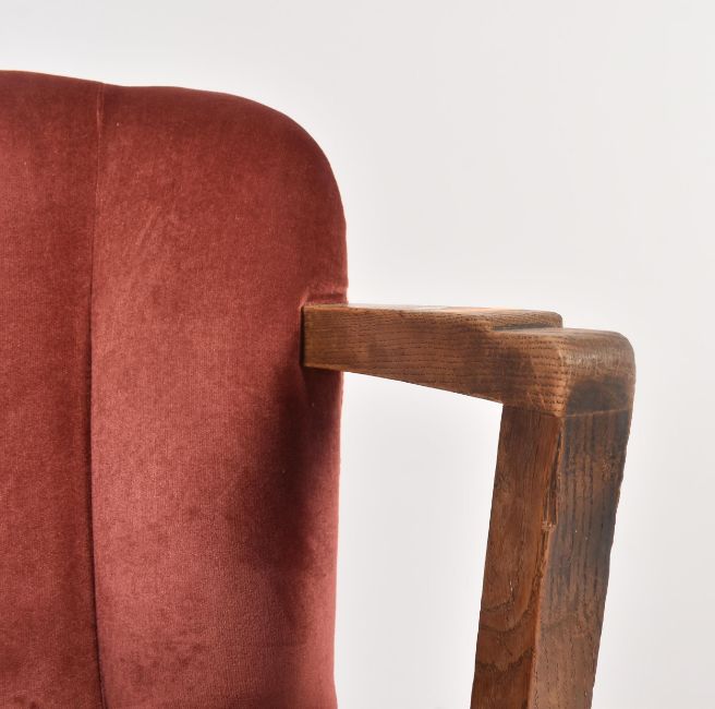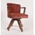 An Art Deco early 20th century circa 1930s oak framed swivel desk chair. The easy chair having clam shell design seat upholstered in pink velour over L shaped oak elbow rests. Raised on a four way splayed base with castors. Measures approx. 86cm x 59cm x 55cm