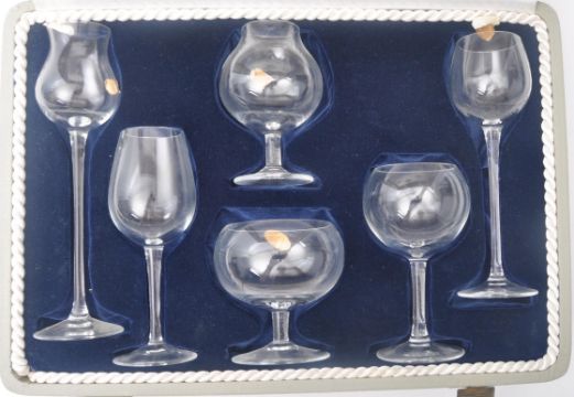 Moser Praha Glass - A vintage 20th century cased set of miniature Bohemia Moser Club's Physiognomical Miniature Snifters glasses. The set to comprise Stout Gentleman, Slim Lady, Long Face, Big Bertha, Moon Face and Long Fellow. Some with stickers. All etched to foot. Tallest measuring approx. 15cm.