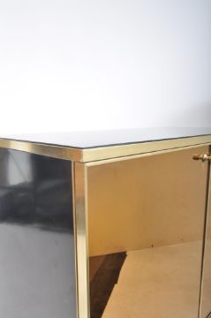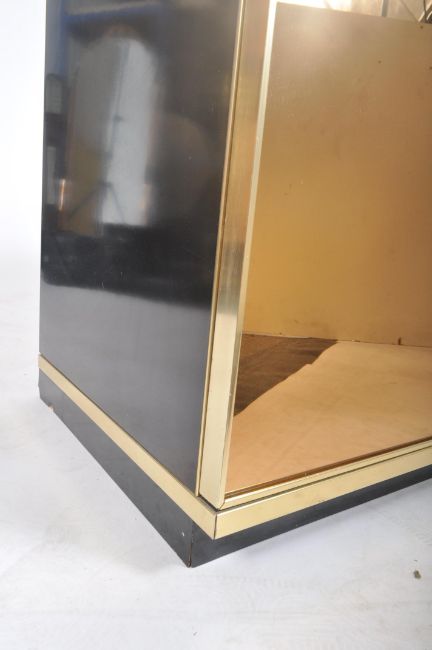 Renato Zevi for Metal Craft - A retro vintage mid 20th century circa 1950s 'Hollywood Regency' gilt brass metal & mirrored front cupboard. The credenza having a black glazed top over gilt metal frame over two rose gold mirrored doors, black lacquered sides. Raised on plinth base. Measures approx. 75cm x 100cm x 47cm.
