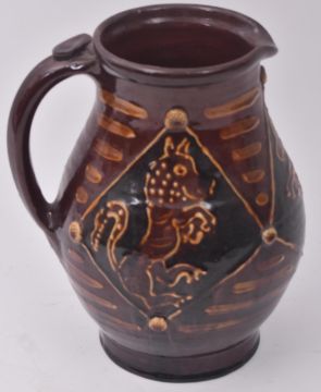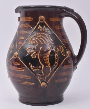 William Fishley Holland (British, 1889-1970) - A mid 20th century ceramic studio art pottery hand made one-off piece single handled jug. The unique vase in brown glaze decorated with in relief stylized wolves depiction within rhombus shapes. Signed by hand to base. Measures approx. 22 x 16cm