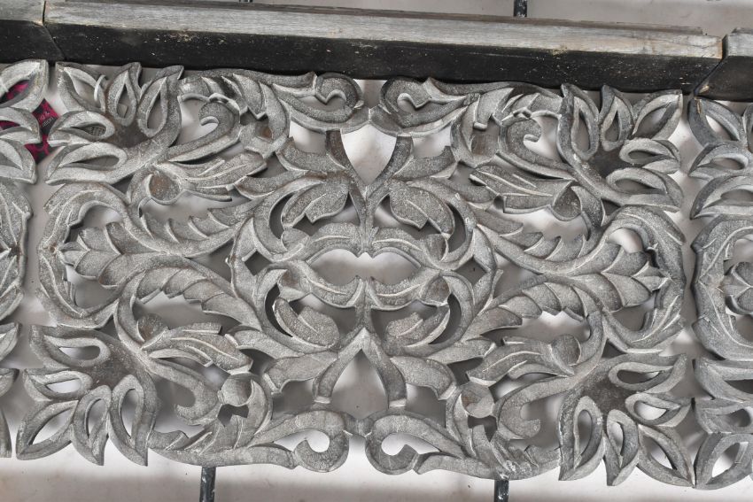 A collection of nine contemporary British Modern Design carved painted wood interior decorative aesthetic features panels. Each panel intricately carved in Oriental inspired foliate patterns. Raised on wooden plinth base. Each measuring approx. 46cm x 62cm x 10cm.