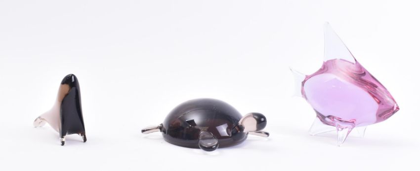 An assortment of vintage mid 20th century Zelezny Brod Czech studio art glass animal figures / sculptures. The lot comprising a Bohemia pink glass angel fish, a brown sea lion with label, together with a brown turtle with label. Largest measuring approx. 4cm x 17cm x 11cm.